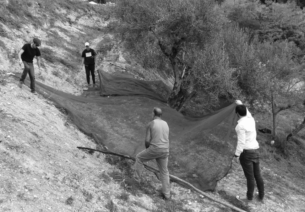 After using small plastic straws to patch up a few holes in the net, we were met by the rest of the team. Our team was now international, with people from Italy, the UK and New Zealand. We arrived at the first olive tree and began preparing the net,setting it up around the tree with our high-techsystem of balancing sticks, tree branches and pallets. Things were just getting started and about to get even more high tech with the arrival of some cutting-edge olive picking gadgetry. Battery powered, extendable and satisfying, we were provided with our hosts new toy, which was a pole that shakes those hard-to-reach olives down from their sun kissed heights into our net. We were now well into the morning picking the low olives,shaking the high ones and collecting the fallen olives. By now we were getting a fair, few olives in the crates.