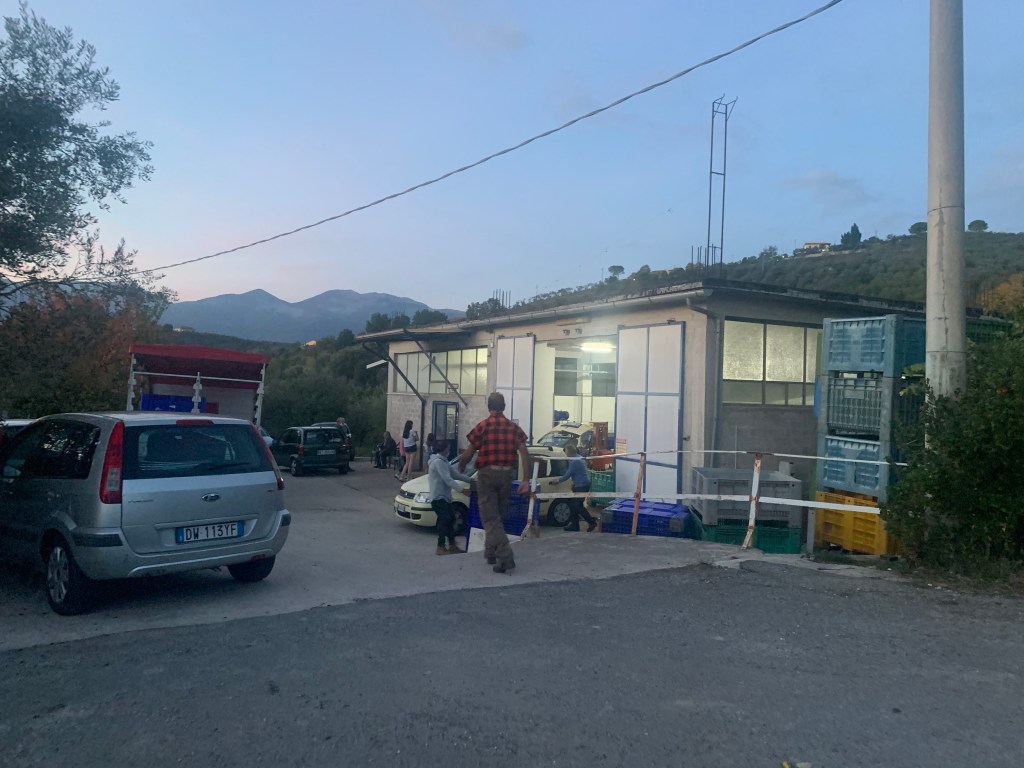 Separating the leaves from the olives is another job! And no one likes a leaver of leaves! Once we had a decent number of olives it was lunch time,which we enjoyed on Mr C’s patio. We drank local wine and ate fresh seafood from one of the local restaurants whilst looking across the perfect back drop of Arpino.
