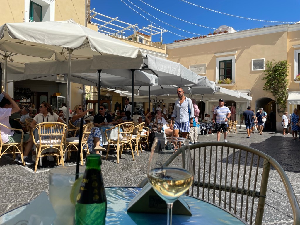 On arrival at the port, we headed straight to the ticket office to buy a ticket for the cable car which will take you from the busy port directly to the main square Piazza Umberto. The cable car is a great way to get through the initial crowds at the port (remember to buy your ticket before queuing for the cable car). Once in the piazza we found a table and relaxed in the shade with a nice glass of wine.
