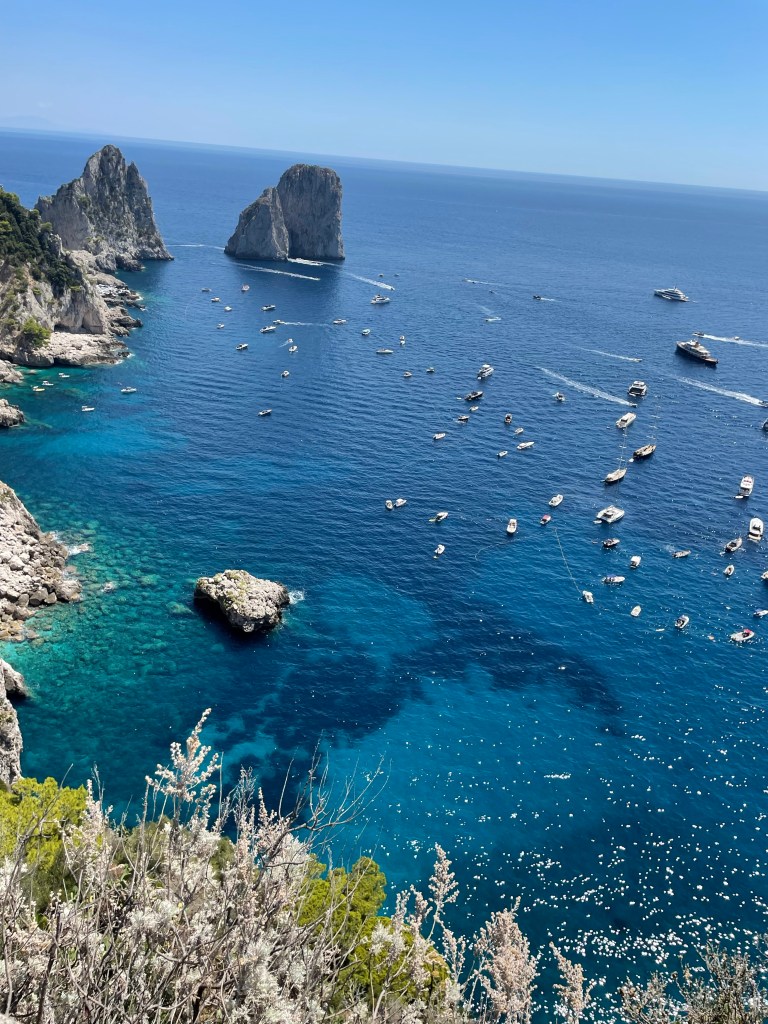 One of the highest points on the island and best views is from the gardens of Augustus or Giardini di Augusto, there is a small charge to enter but itโs a great way to see the sea views and hundred or boats that are dotted around the coast line. There are plenty of benches to take a break and admire the range of colours from the many flowers featured in the gardens.
